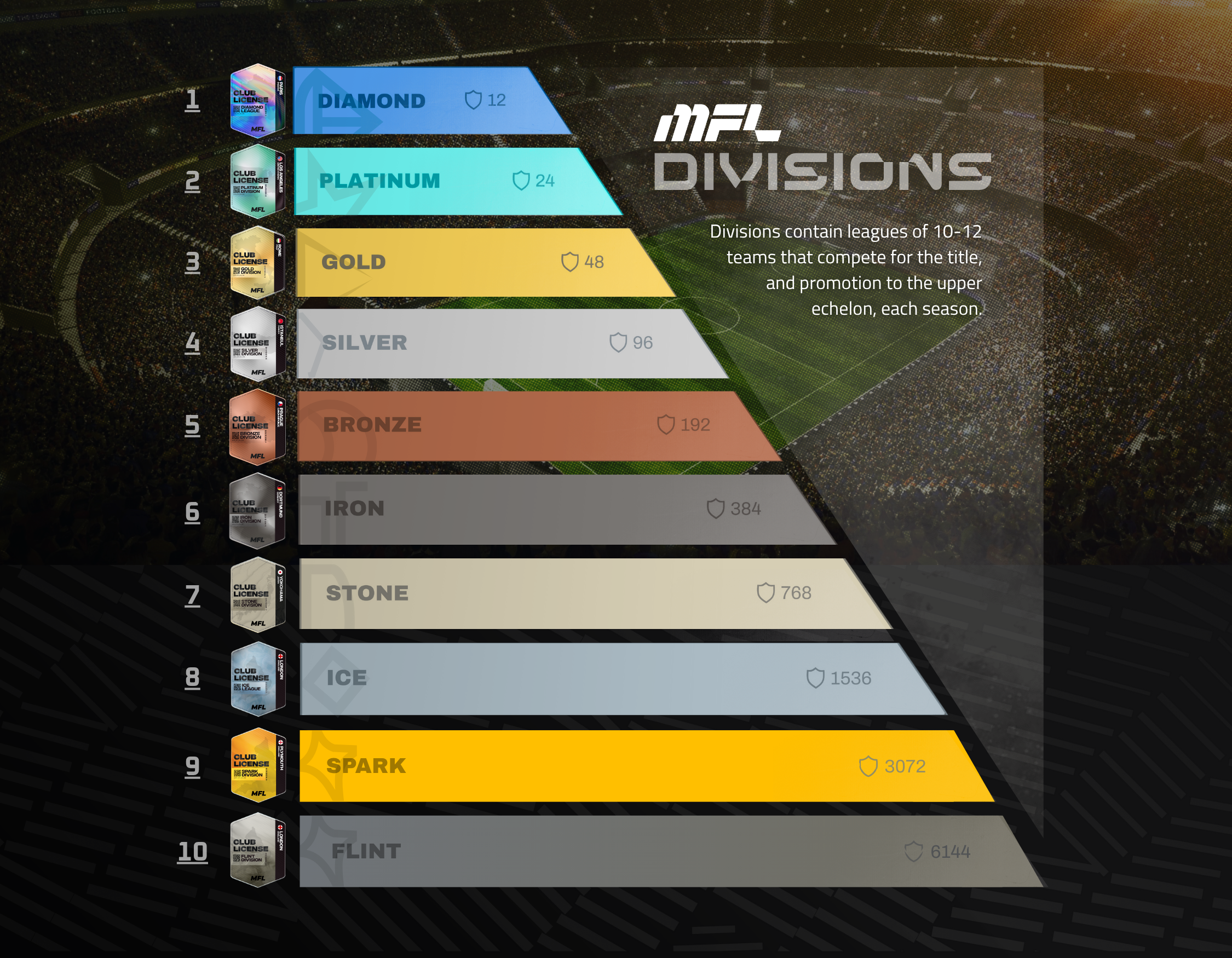 10 divisions, 6-week seasons, promotion, relegation. Every match is PvP.