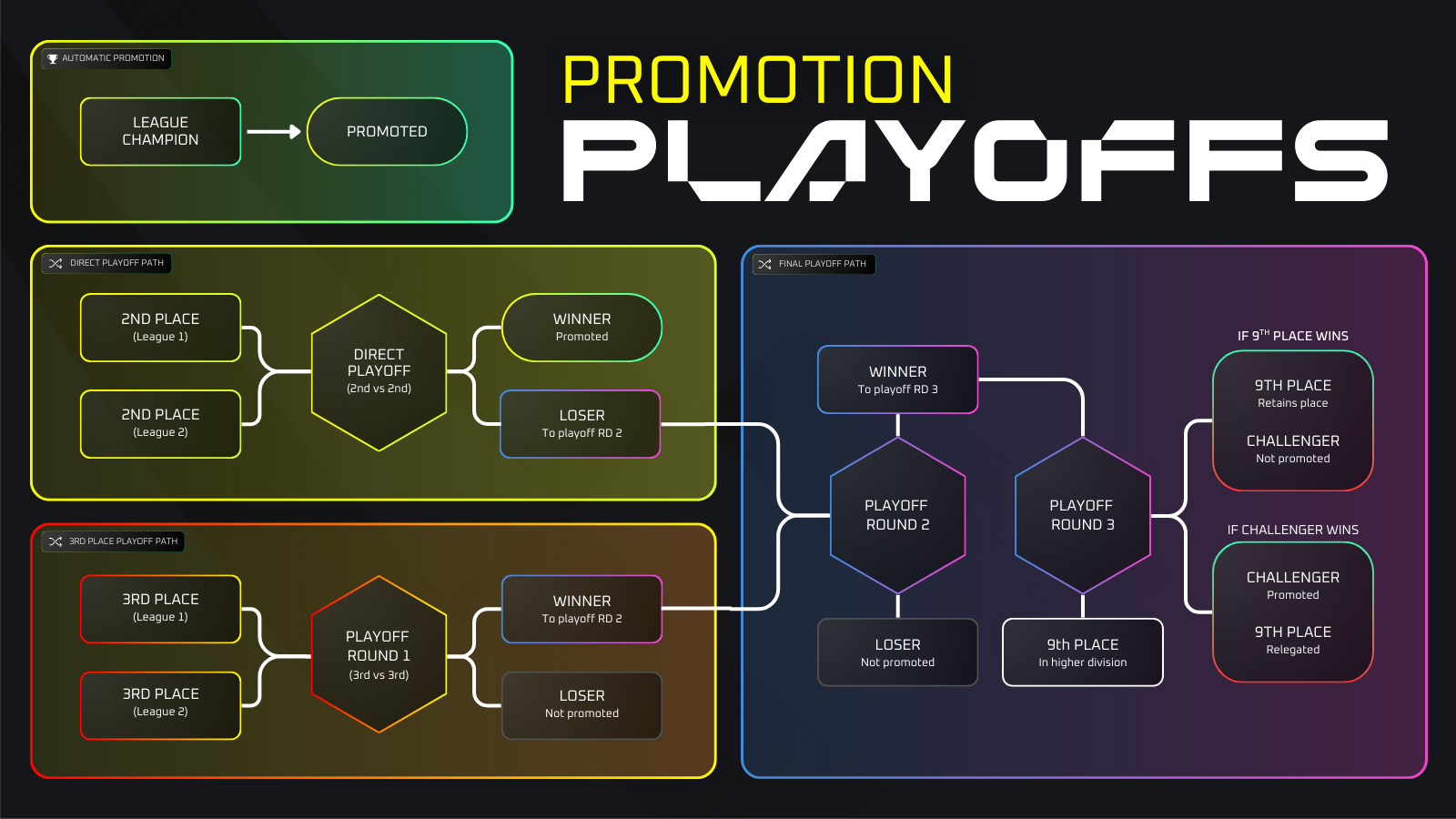 | Playoff Round 3 | Round 2 winner earns promotion. The loser also faces the 9th-place team from the upper division fighting to avoid relegation |