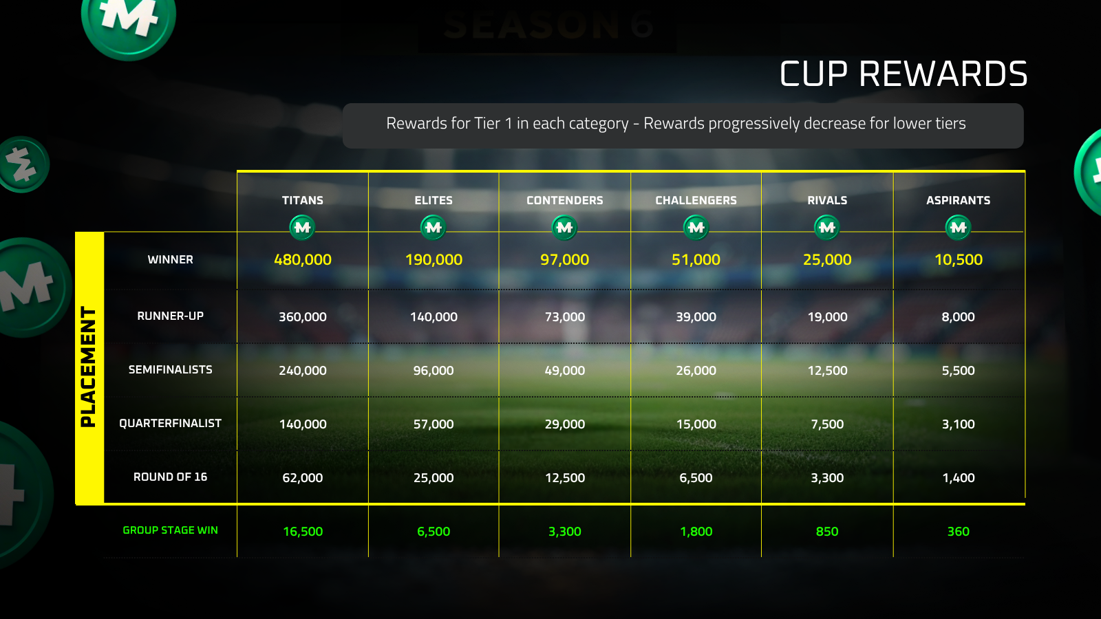 Las recompensas de competición son la principal forma en que $MFL fluye al juego. Cada temporada, los clubs y sus jugadores ganan $MFL basándose en lo bien que rindieron. Cuanto mejor lo hagas, más cobra todo el mundo.