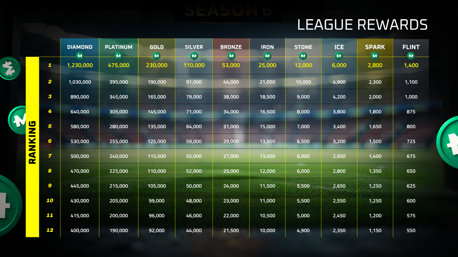 Tu pago de liga se determina por tu posición final en la liga. Termina más arriba, gana más. Pero la división importa igual. Un resultado de mitad de tabla en Diamond paga significativamente más que ganar en Ice. Subir la escalera de ascensos no es solo cuestión de prestigio. Es cuestión de ingresos serios.